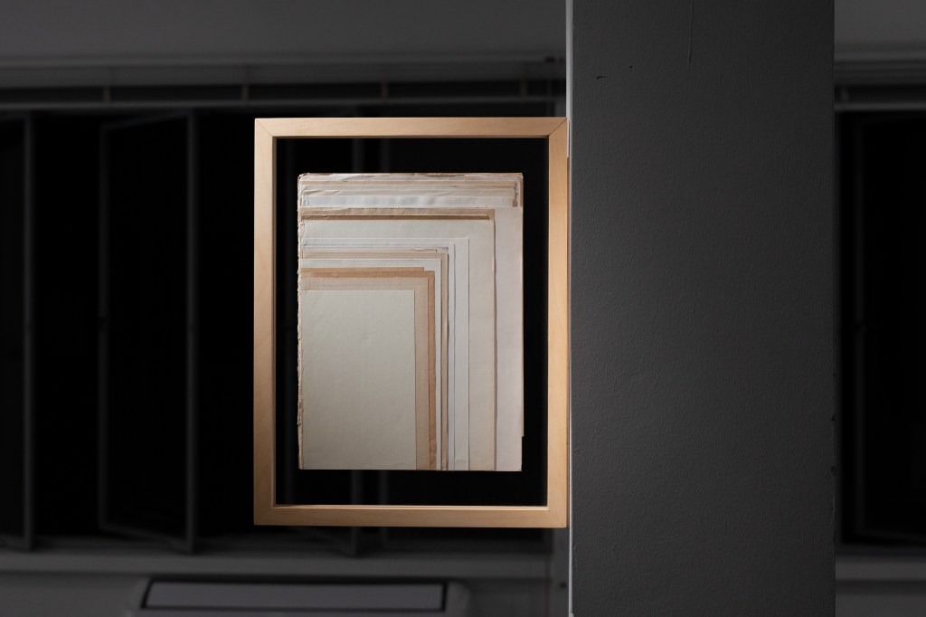 Around a decade ago, the artist’s practice often involved the physical dismantling of encyclopedias, history books, and lexicons. By obsessively tearing pages and extracting spines she sought to expose the manual labor embedded in intellectual authorship. This process became a fragmented, personal form of reading, an intimate re-interpretation of institutional knowledge. During that time, the artist consciously preserved the blank endpapers that tether a book’s body to its cover, as the liminal, transitional space so often ignored.