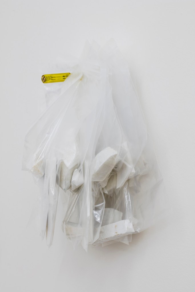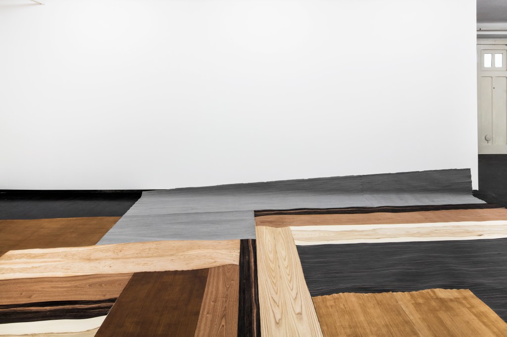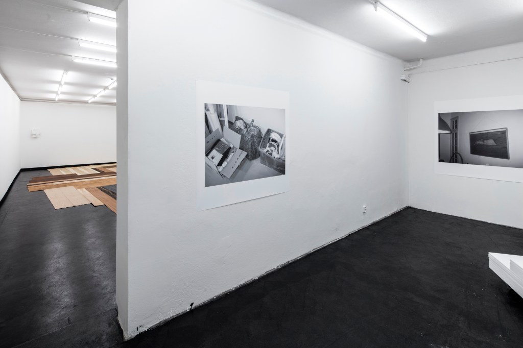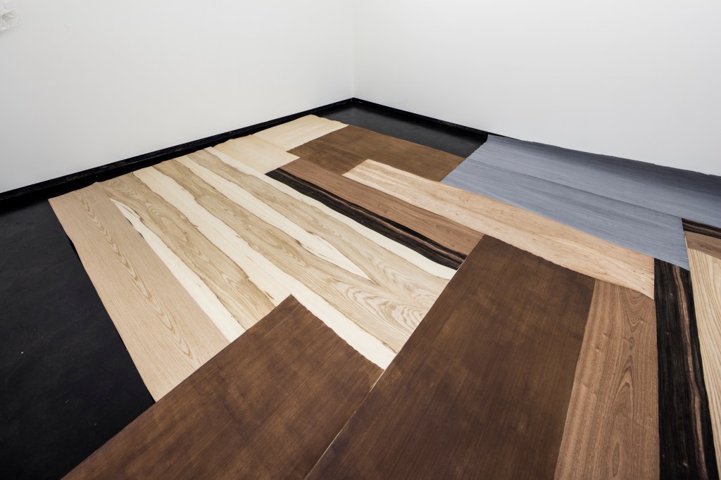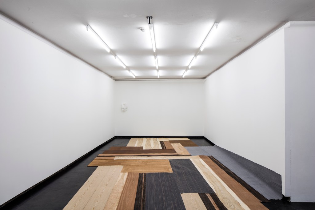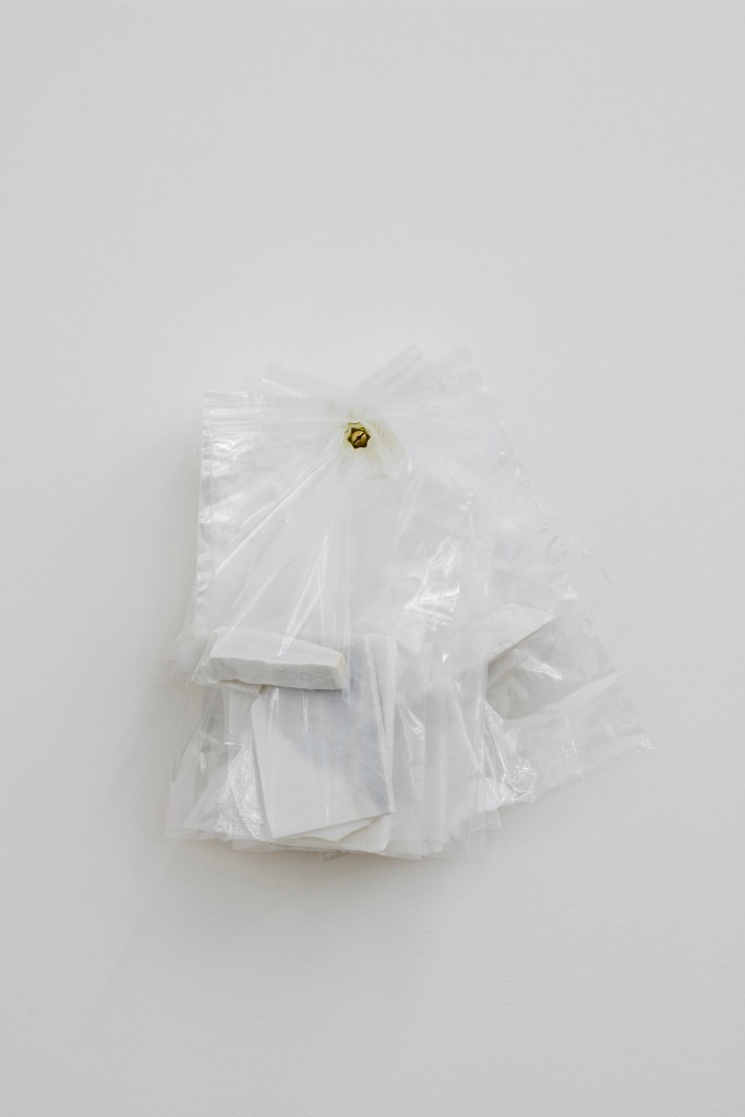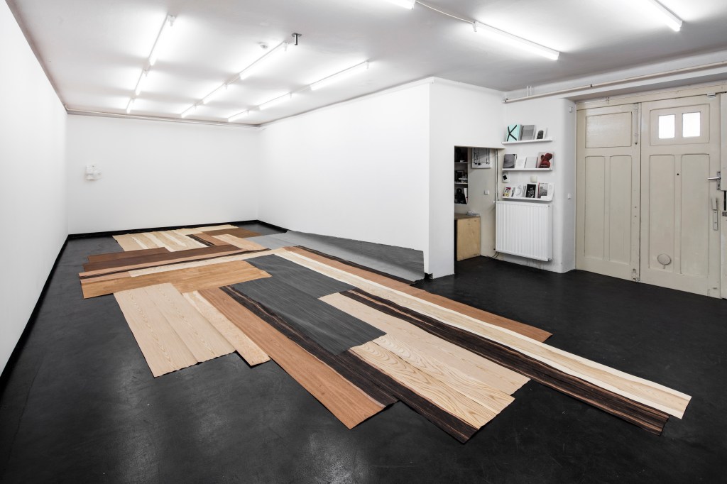 Taking as a starting point two images, one from my studio and one from my home, depicting moments of inaction,the exhibition “Be Quiet” functions as a spatial experience with references to (collective) movement and personal routes. The gallery space was filled with a large floor sculpture, a collage of wooden veneer limiting the space, referencing aerial photography. Nailed on the walls, there were plastic sachets with marble chips in them.