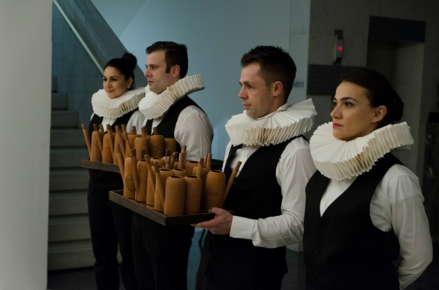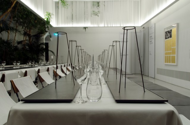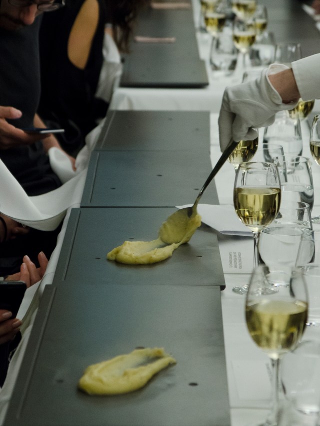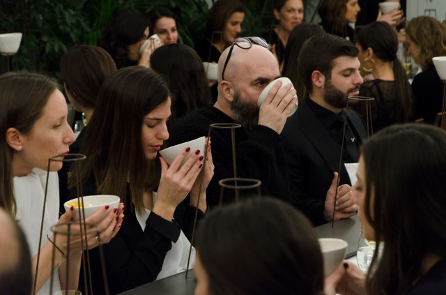 The dessert was granite served in a ceramic semi-feeding bottle, semi-bong device. Design meets primitivism whilst objects become ceremonial rather than just utilitarian. Through a series of unexpected episodes the dinner evolves into a collective performance that invites us to negotiate our primal instincts. Serving utensils, materials, dishes, and dining companions are put in a new sequence, known but unprecedented.