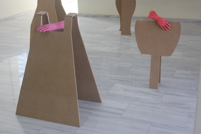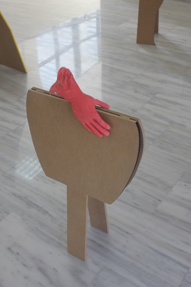 Pour, stir, dissolve, serve or march design is based on the structure of advertising boards and transforms them into items of clothing–costumes that are reminiscent of both a cooking apron and a picket sign. After visiting the Olympic Village Women’s Association, curious about what brought these women together, I started thinking whether their meetings include characteristics of political self-organization, and whether a sewing class could put someone on the path of a protest. The resulting sculptural works suggest, through the wooden shapes, the firmness both of domestic work and political action and humorously indicate, through swollen gloves, the human labor.